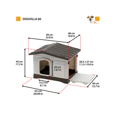 - La Ferplast Caseta Dogvilla 60 es un refugio exterior para perros pequeños, fabricado en resina termoplástica resistente a la intemperie.