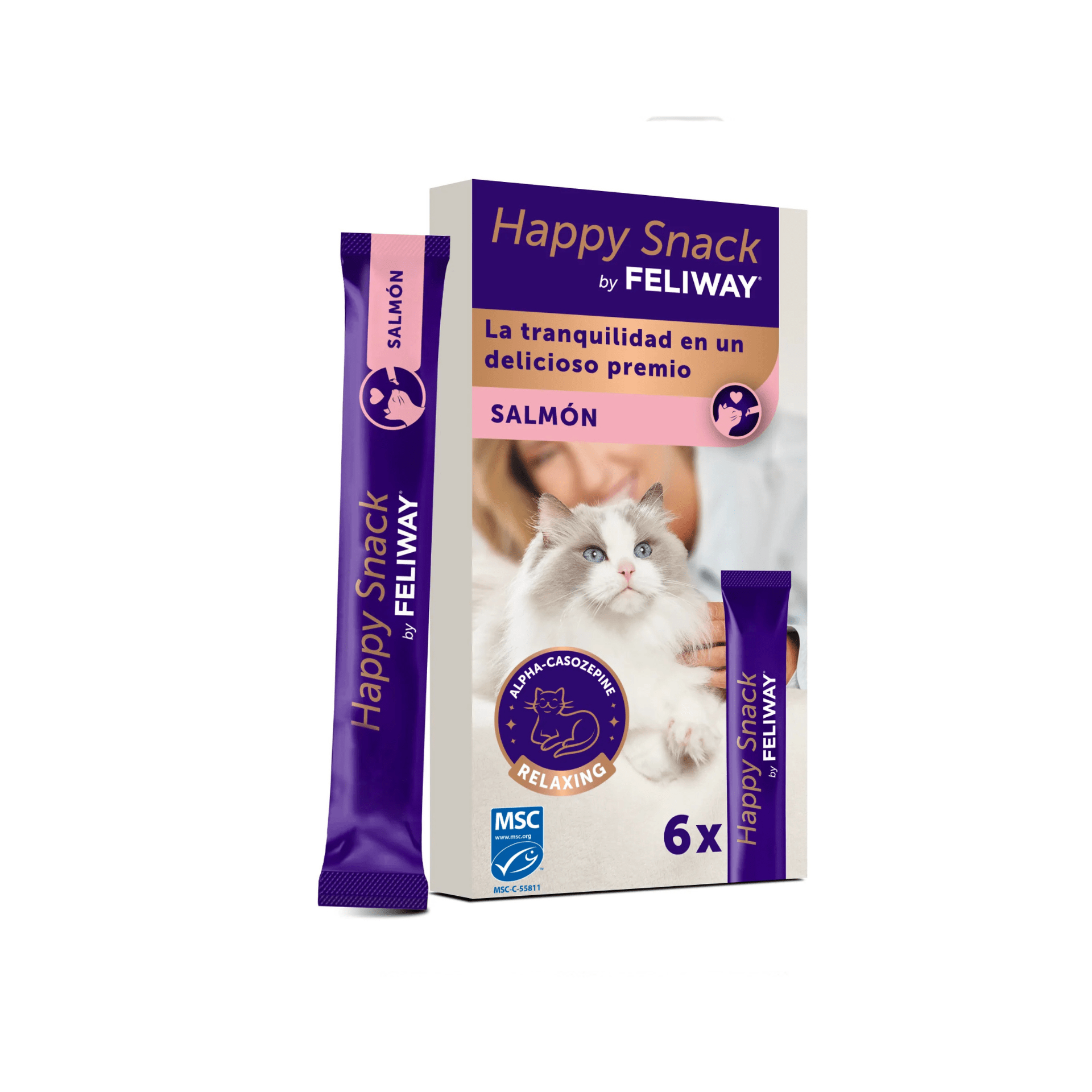 - Snack cremoso sabor salmón para gatos (a partir de 12 semanas), formulado con alfa‑casozepina para promover la calma durante situaciones estresantes.