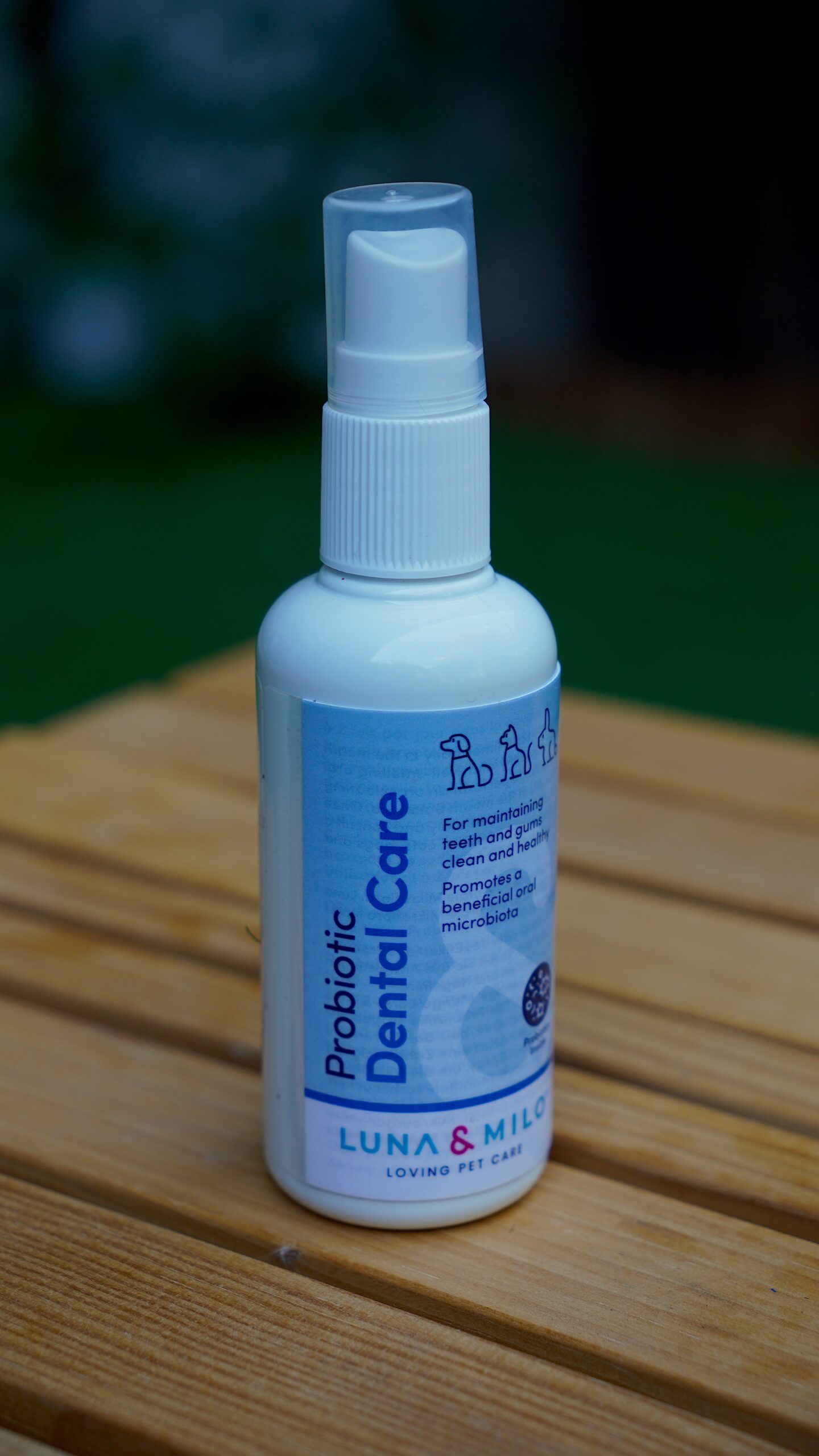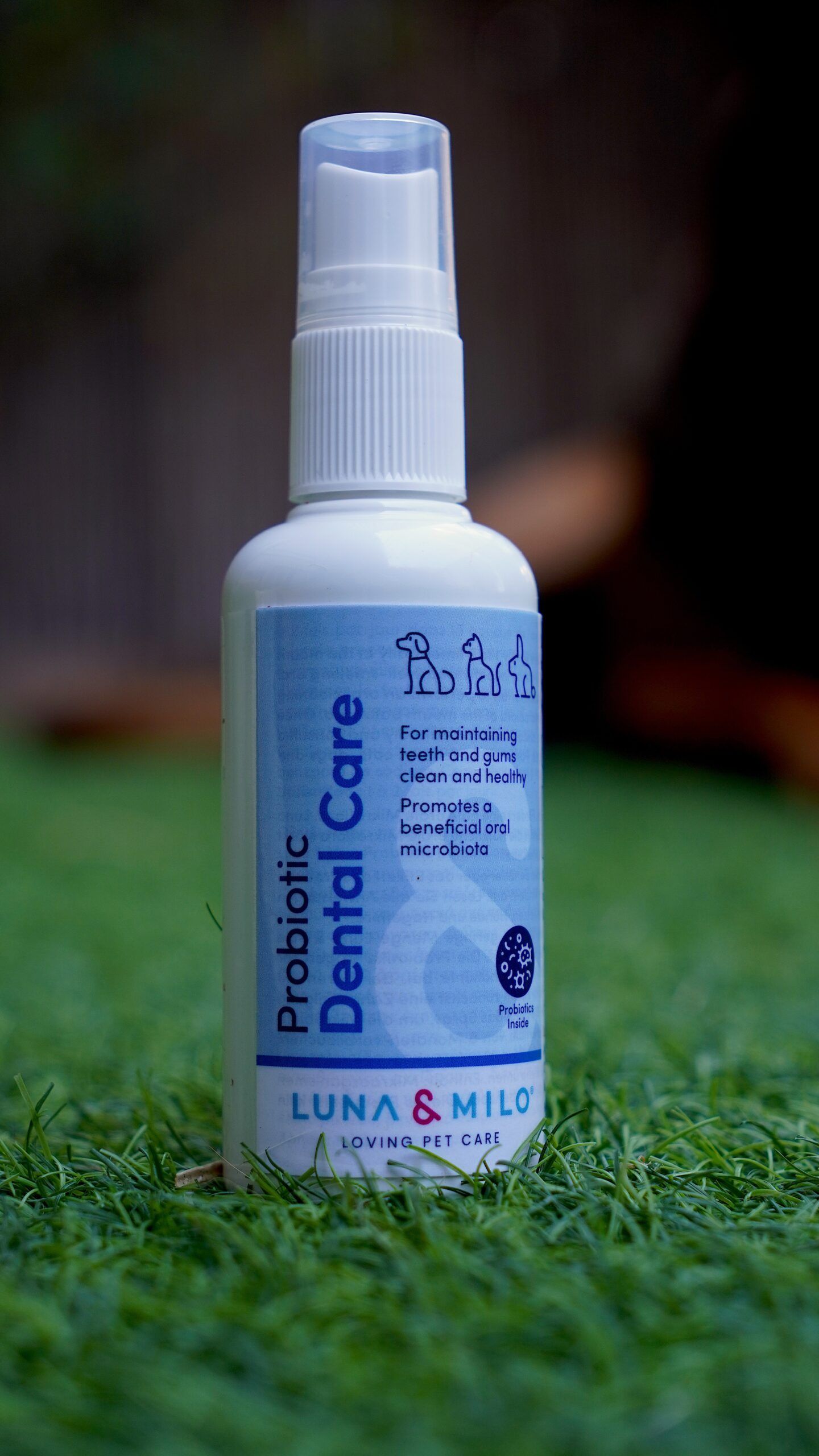 Luna&Milo Cuidado Dental Probiótico Para Mascotas 100 ml es un spray bucal innovador diseñado para mantener la salud oral de perros y gatos. Su fórmula natural, enriquecida con probióticos, favorece el equilibrio de la microbiota oral, contribuyendo a la limpieza de dientes y encías y al frescor del aliento.